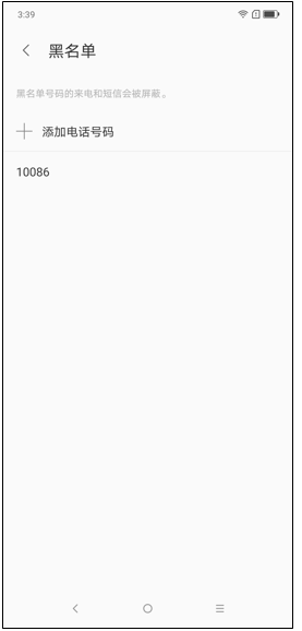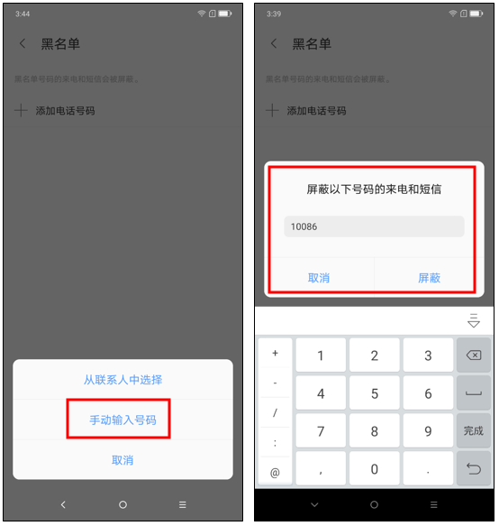 【添加电话号码】,以点击【手动输入号码】为例,输入号码后点击【屏蔽】,即可完成黑名单的设置。