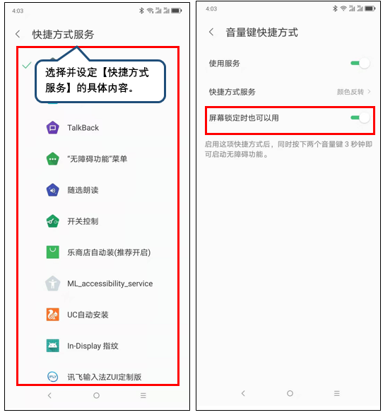 2.点击【音量键快捷方式】—点亮【使用服务】—设定【快捷方式服务】的具体内容、设置【屏幕锁定时也可以用】。