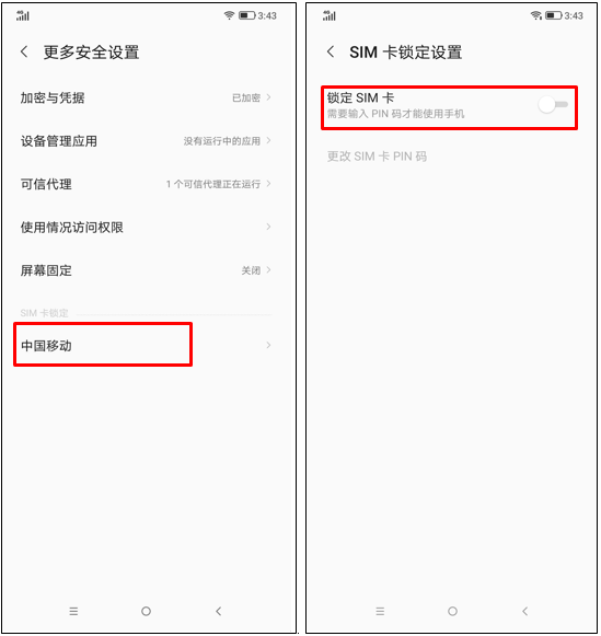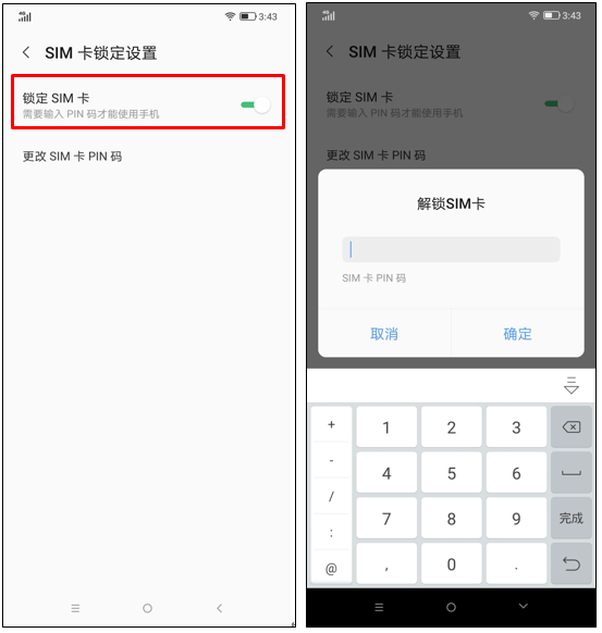 答:如需进行SIM卡解锁,点击【锁定SIM卡】右侧开关使之变为暗色,然后输入正确的PIN码,点击【确定】即可进行SIM卡解锁。
