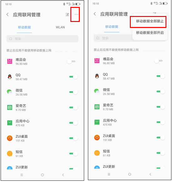 2、如果想要关闭全部应用—点击右上角图标—点击【移动数据全部禁止】—【全部禁止】。