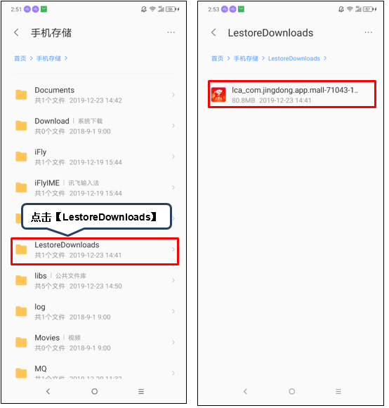 答:在【文件管理】—【手机存储】—【LestoreDownloads】中。