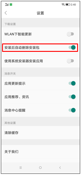 答:在手机桌面,点击【应用中心】—【我的】—【设置】—点击【安装后自动删除安装包】使之为亮色,即可。